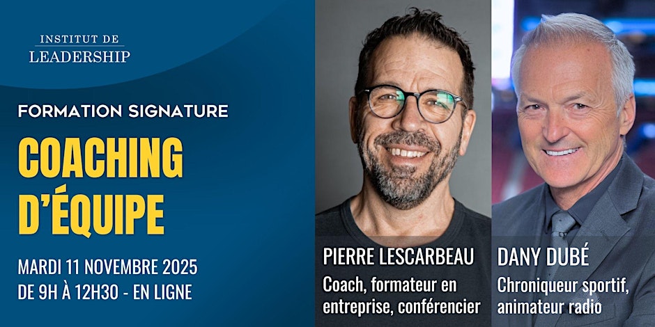 Le mardi 11 novembre 2025, de 9h à 12h30, bénéficiez de l’expertise de Pierre Lescarbeau, formateur chevronné en leadership et coach professionnel, reconnu pour sa capacité à transformer les pratiques de gestion. Et laissez-vous inspirer par Dany Dubé, communicateur d’impact et ancien entraîneur d’équipes sportives de haut niveau, qui partagera sa vision du leadership mobilisateur et du coaching dans des contextes de performance.