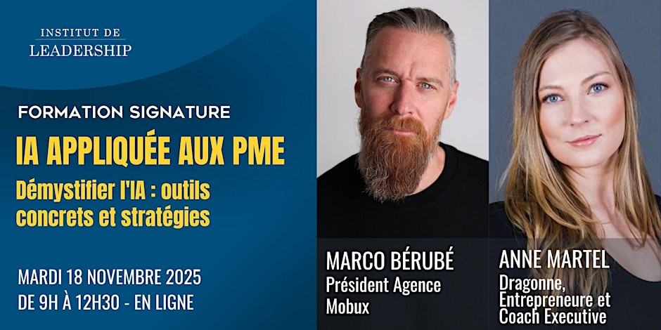 Le mardi 18 novembre 2025, de 9h à 12h30, profitez des conseils stratégiques de Marco Bérubé, expert reconnu en innovation numérique et vulgarisateur de talent. Et laissez-vous inspirer par le parcours entrepreneurial de Anne Martel, qui partagera sa vision humaine et pragmatique de l’IA au service des petites entreprises.