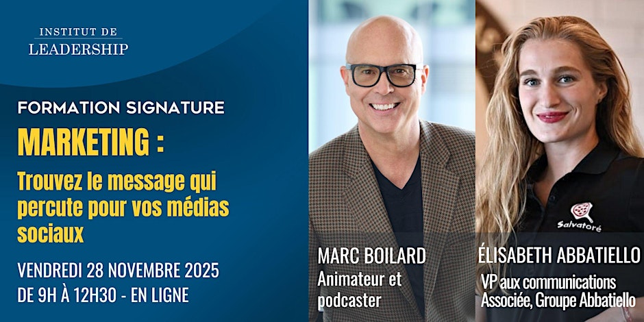 Le vendredi 28 novembre 2025, de 9h à 12h30, plongez dans les meilleures pratiques avec Marc Boilard, formateur et communicateur d’expérience, spécialiste des stratégies de vente percutantes. Puis, laissez-vous inspirer par Élisabeth Abbatiello, qui joue un rôle central dans la croissance exceptionnelle du Groupe Abbatiello (Pizza Salvatoré, Topla!, Jack le Coq et Crèmerie chez Mamie), qui viendra partager son expérience terrain et sa vision d’un marketing humain et efficace, même en contexte de forte concurrence numérique.