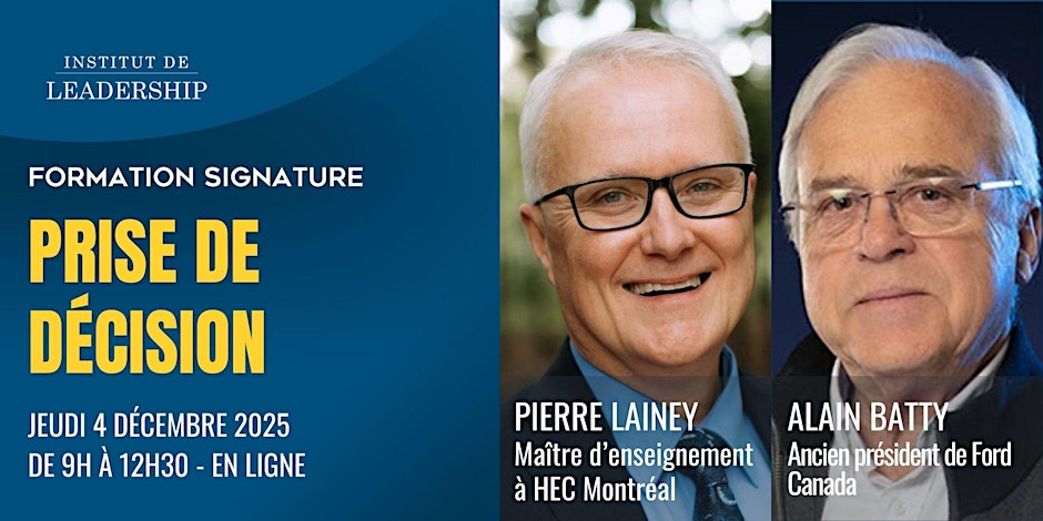 Le jeudi 4 décembre 2025, de 9h à 12h30, participez à la formation animée par Pierre Lainey, Maître d'enseignement senior à HEC Montréal, psychologue organisationnel et expert en comportement décisionnel, elle vous aidera à adopter une posture plus stratégique dans vos décisions au quotidien. Vous entendrez également le témoignage d’Alain Batty, dirigeant reconnu, qui partagera ses apprentissages issus de situations complexes ayant exigé des choix clairs, rapides et alignés.
